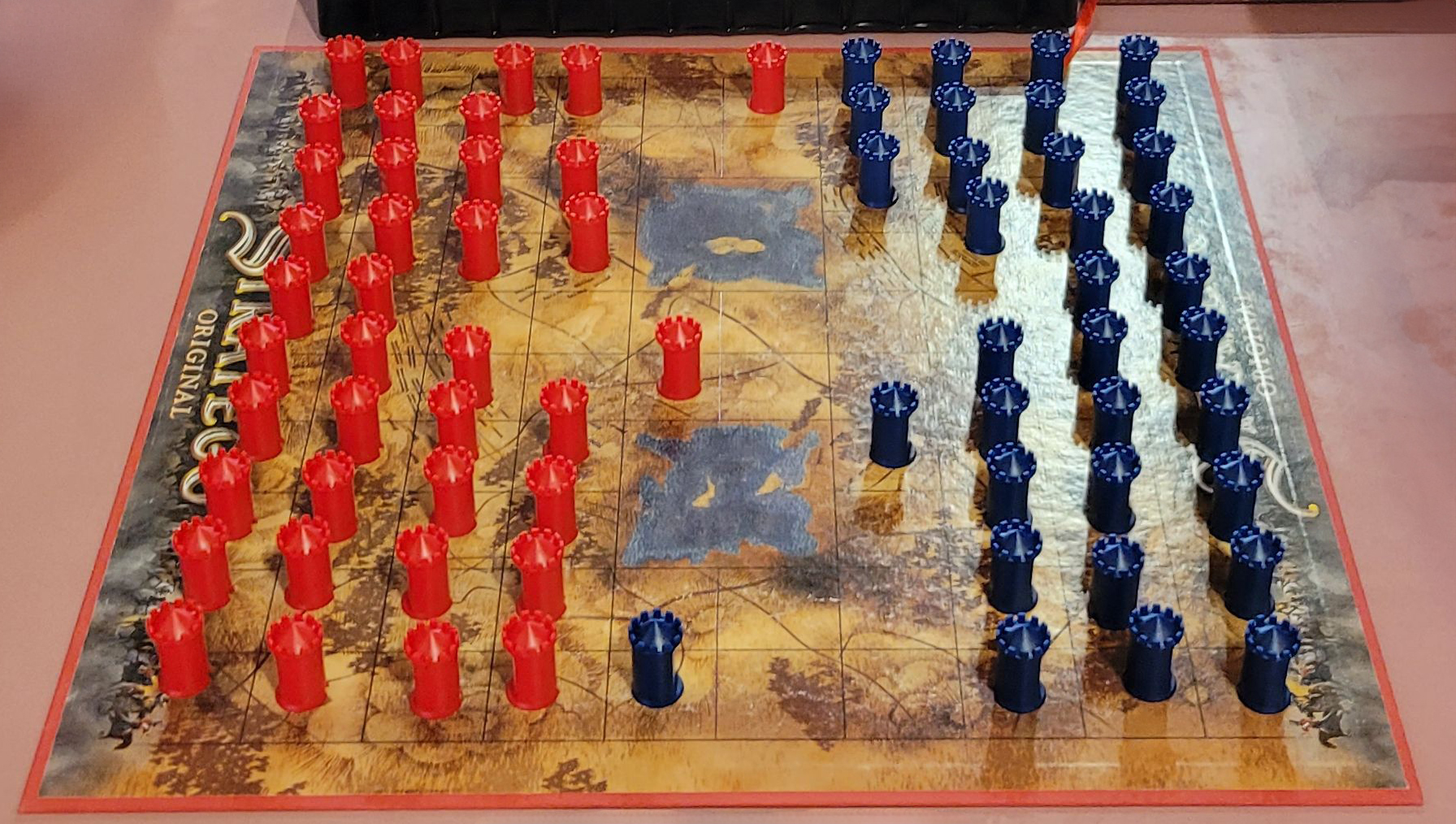 - Gespielt wird auf einem 10×10‑Spielfeld mit 40 Spielsteinen pro Spieler.
